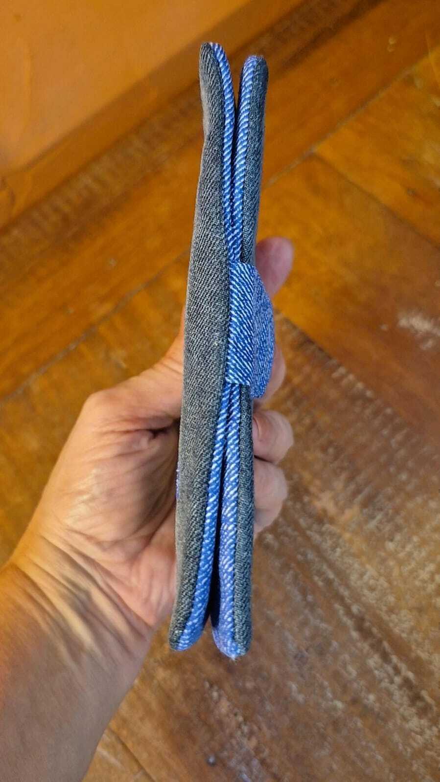 Carteira Jeans Reciclada , produzida com reaproveitamento do jeans, forrada com reaproveitamento tecido de algodão estampado, fecho botão imã ouro velho, com aplicação tecido ponto turístico.